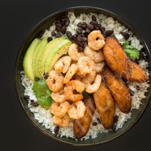 • Top with shrimp, half of an avocado and 5 plantain slices